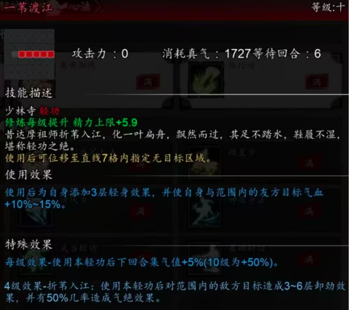 少林寺专属轻功「一苇渡江」为高机动性代表。释放后可直线位移至七格范围内任意空置区域,是突破包围、抢占地形或规避关键技能的理想选择。技能生效后,下一回合同样获得50%集气加成。实战中可叠加三层「轻身」,并额外赋予3至6层「聚气」与「灵动」效果,持续强化移动效率与出手频率。
