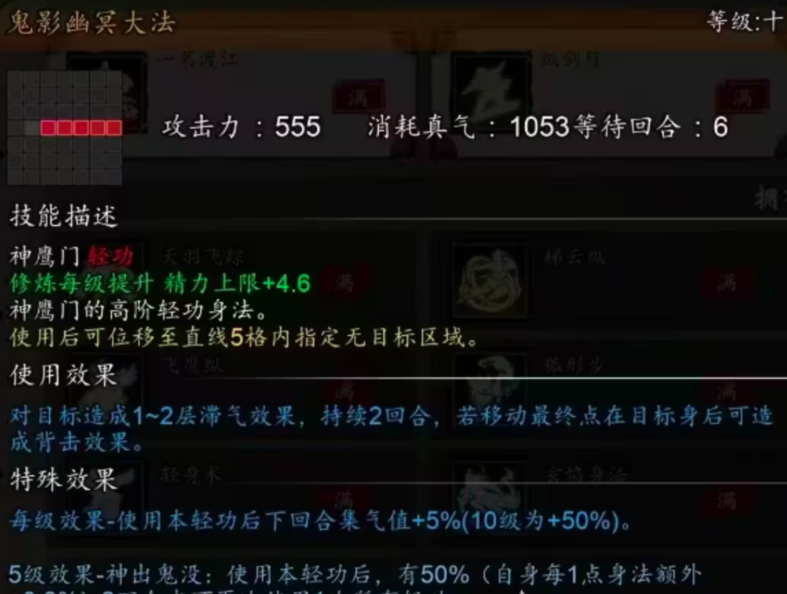 首推江湖武学「云涛晓雾凌波舞」。该轻功最大优势在于零真气消耗释放,适用于持久战与高频拉扯场景。需注意其触发门槛:仅当角色真气不低于20%时方可激活凌波效果;成功触发后,下一回合集气值提升50%,显著压缩行动间隔。此外,该技能自带被动加成——身法属性固定+35点,并对目标施加1至2层「刺目」减益,削弱敌方命中能力。