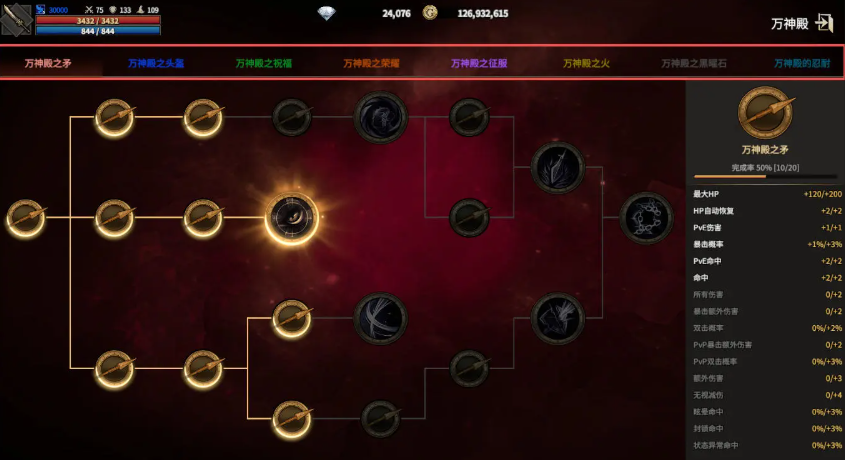 万神殿并非单英雄专属培养线,而是作用于全体出战英雄的基础数值层:包括最大生命值、物理攻击力、物理防御力等核心属性。当玩家集齐指定装备套装后,还可额外激活神圣伤害加成、暴击伤害提升、生命吸取率、韧性值等进阶属性,实现多维战力叠加。此外,随着主线进度推进,玩家可通过挑战特定副本解锁“专属技能槽”,例如“万福神殿”可同步降低技能冷却时间并提升角色负重上限,在实战中兼具输出增益与操作容错优势。