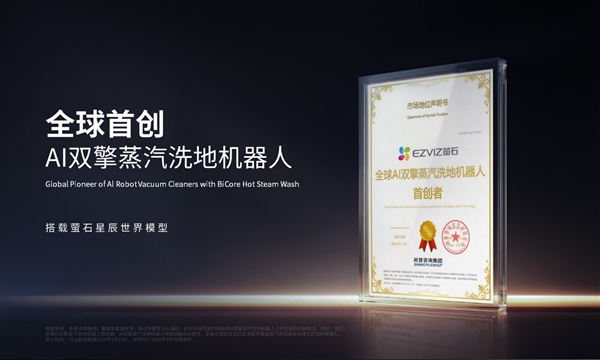 萤石Stella星辰系列的核心竞争力,在于其独家搭载的全球首创双擎双热活水洗地方案。这一创新成果已获得尚普咨询颁发的“全球AI双擎蒸汽洗地机器人首创”市场地位声明,其技术创新性与行业领先性得到权威认可。该套方案由“BiCore Suction双擎分区直吸系统”与“HotSteam Wash澎湃蒸洗双热系统”协同构成,实现吸尘、洗地、自清洁全链路升级,彻底打破传统清洁技术局限,实现清洁效率与清洁效果的双重飞跃。