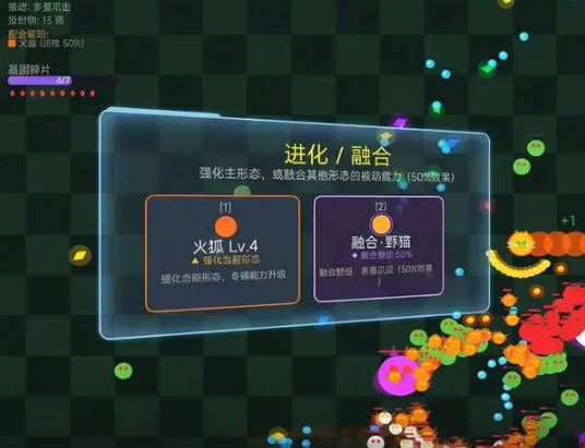 游戏主要的乐趣就在于高度自由的基因进化体系。不同于传统手游的固定养成模式,每一次的进化全部都是由自主决定的。野外地图中就会散落着各类基因碎片,在击败敌方生物时,就可以获取高属性的片段。在收集足够的碎片之后,玩家就可以自由进化成多种不一样的形态,每一种形态都会有专属的技能和特性。例如蝙蝠有一个夜间隐匿,猎鹰具有高空突袭。搭配不同的基因组合,就可以玩出千变万化的战斗风格。