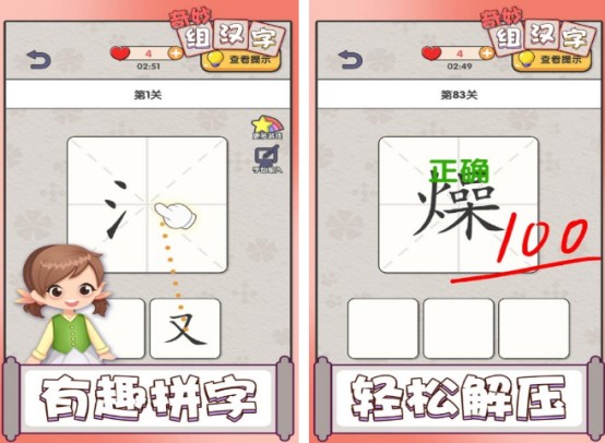 以汉字结构解析为核心玩法的益智类游戏,涵盖基础字形辨识、偏旁组合推演等内容。设有初级至高级多个难度梯度,每轮题目从给定字符池中选取正确汉字进行拼合,答对即可解锁新关卡。有助于提升识字效率与空间思维能力。