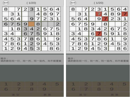 经典数独玩法移植作品,严格遵循九宫格规则:在9×9网格中填入1至9数字,确保每行、每列及每个3×3子宫格内数字不重复。题库分级明确,从入门级到高阶挑战全覆盖,长期练习有助于提升逻辑推理能力与专注力。