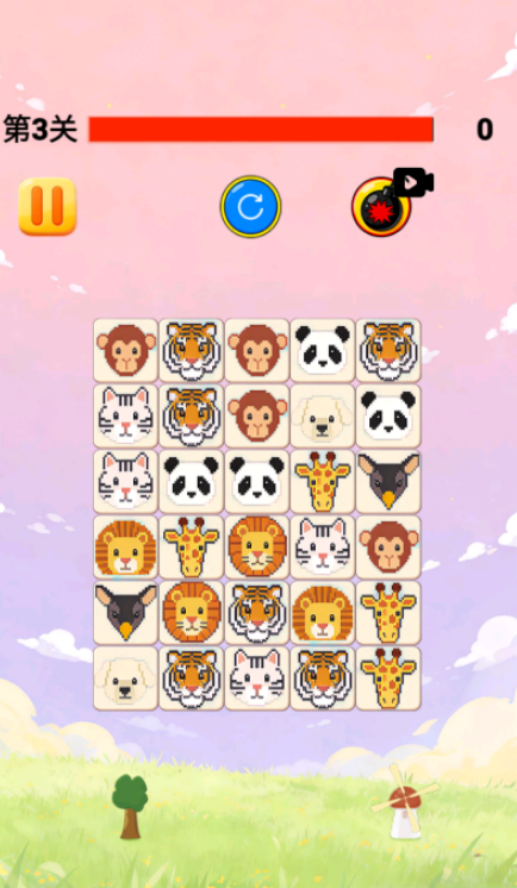 以Q版动物角色为核心元素的经典三消单机作品。关卡设计由浅入深,界面中随机排列猴子、老虎等卡通头像,玩家通过滑动操作实现横向或纵向三连及以上匹配消除。内置刷新、炸弹等实用道具,助力突破难点,兼顾策略性与操作流畅度。