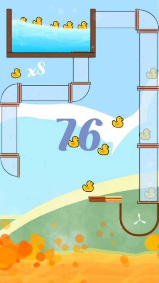 本作以极简规则构建强沉浸感,主打“数字目标+实时反应”玩法。界面采用大面积蓝、土黄配色,营造温暖舒缓的视觉氛围。每关明确标注需捕获鸭子数量(如25只),玩家需在动态管道中精准接住指定数量目标。该机制对观察力、手眼协调及短时专注力均有良好锻炼效果。