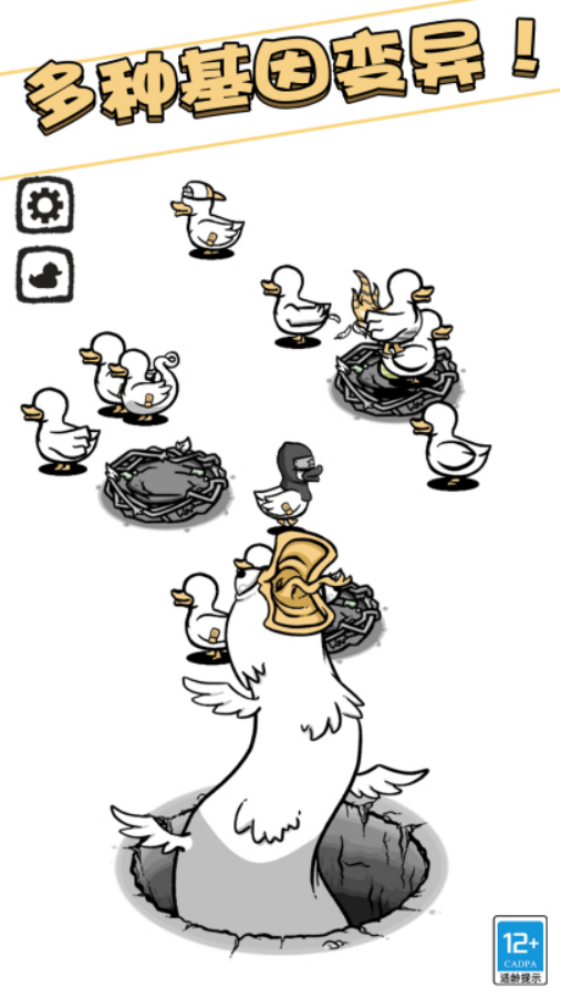 本作采用黑白极简2D卡通风格,线条干净利落,整体界面清爽透气。操作方式极为直观,全程单指点击即可完成交互,节奏舒缓且解压感突出。游戏内设高度自由的变异系统,鸭子各部位可随机组合生成全新形态,孵化过程类似盲盒体验,持续激发探索欲与收集成就感。