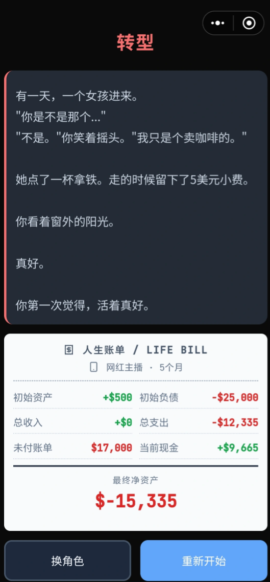 房贷、车贷、医疗账单等刚性支出构成多层经济压迫体系,随之引发的精神负荷亦不可忽视。每位角色均设有独立心理耐受阈值,一旦突破即触发“精神斩杀线”,导致不可逆的游戏进程终止。此时需立即调整策略重心,避免陷入双重崩溃。持续性的生理痛感与心理损耗将加速角色体面度衰减,能否在严重失血的现金流中实现逆转?是走向社交名流崩塌为街头流民,抑或从底层起点完成阶层跃迁?答案由您的每一次文字抉择决定。