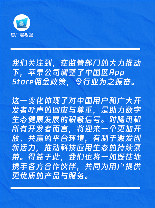 针对苹果此次调整佣金费率的动作,腾讯公司回应称,在监管部门的大力推动下,苹果公司调整了中国区App Store佣金政策,令行业为之振奋。