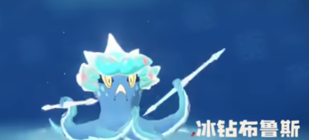 然后是冰钻布鲁斯。这只的炫彩版本颜色是蓝色和白色搭,跟普通版本来比,更好看一些。这个颜色就看起来比较像冰块,视觉上挺舒服的。骑乘姿势也比较特别,不是坐在背上,而是坐在头顶上。走路速度在陆地上很慢,甚至比小洛克跑步还要慢,这一点确实有点拖后腿。不过到了水里就不一样了,速度明显快起来,所以如果地图里有水路,骑着它走水路还是挺合适的。
