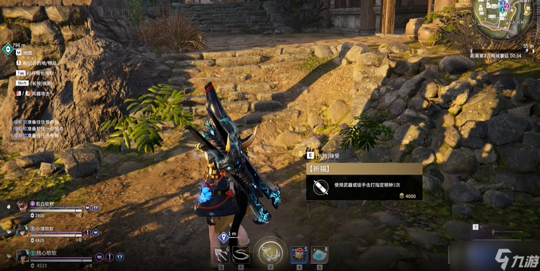 地图上的任务卷轴有多种类型,完成方式和风险收益各不相同。祈福任务相对简单安全,通常只需按指引找到钟并敲击三次即可完成。寻宝任务会指引玩家前往特定区域开启隐藏宝箱。追击任务则属于PVP玩法,分为主动追击和被追击两种模式,接取后地图会标记目标玩家,需要在规定时间内击败对方或成功存活。叫阵任务风险与回报最高,接取后会立即暴露自己的位置给全图玩家。还有礼拜任务需要与土地神像互动,返魂任务则与阵亡复活机制相关。