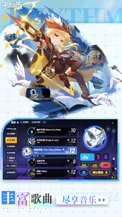 采用多章节结构,涵盖电子、古典、摇滚等多元曲风,难度梯度覆盖广泛。玩家可根据自身反应速度与操作习惯灵活选择关卡,新手可从低速谱面起步,高手则可挑战高密度高速段落。玩法逻辑简洁:紧盯动态节拍线,依据音符出现位置、移动轨迹及持续时间,在准确时机完成点击,即可同步完成演奏与任务目标。初期可能存在节奏适应期,经数次练习后即可顺畅通关整曲,成就感显著。