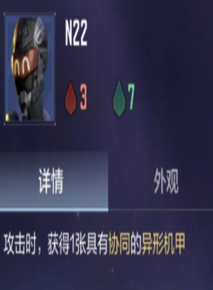 N22是阵容中唯一的蓝色品质角色,起手获取难度较低。其攻击动作可稳定生成1张异形机甲类协同牌,是前期协同资源积累的关键手段,尤其在协同牌尚未成型阶段,能有效加速体系构建节奏。
