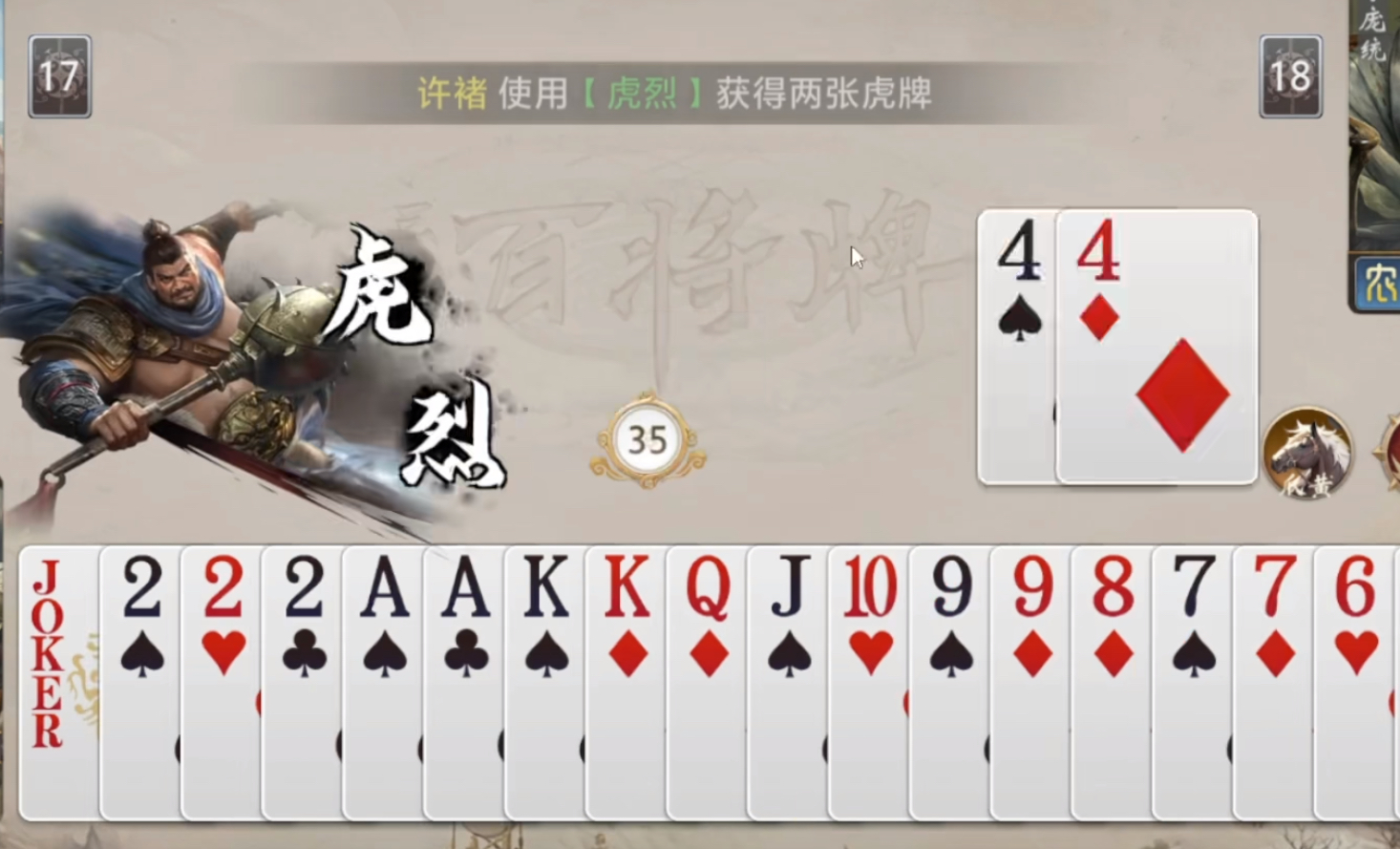 【裸衣】则作为关键衔接技存在:当你打出“炸弹”牌型时,立即重置【虎烈】的使用次数。需注意的是,两项技能每次生效后均归零计次,因此整套操作链的运转核心在于——以“炸弹”为触发锚点,高频刷新【虎烈】,持续生成并迭代【虎牌】。这种“消耗→刷新→再升级”的循环,构成了许褚的核心成长路径。