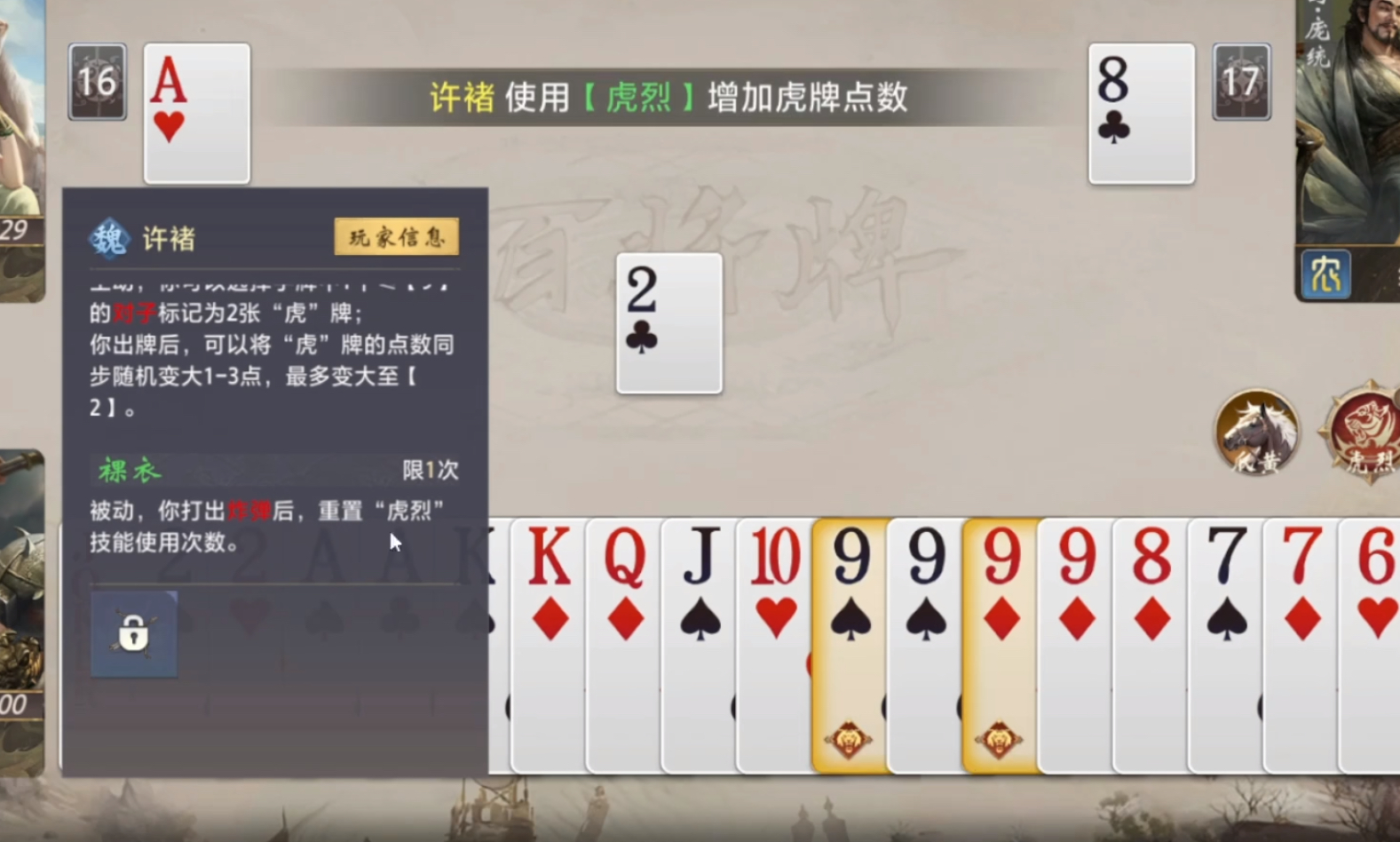 许褚归属魏国阵营,其核心机制围绕两个技能构建:【虎烈】与【裸衣】。其中【虎烈】为回合内主动技——在你的出牌阶段,可选定一张手牌中点数≤9的对子,将其标记为【虎牌】;该牌在你完成出牌动作后,会自动随机提升1至3点数值,且上限固定为【2】。这一设计本质是将低价值对子转化为高适配性牌型,显著缓解手牌冗余压力,尤其适用于应对多轮拉锯战中的点数堆积问题。