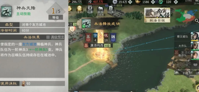 【神兵天降】(灵系)是团战支援类兵法中的高价值选项。可在危急时刻向友方城池空投一阶神兵援军,有效延缓敌方破城节奏,为组织反攻争取关键窗口期。但需注意:该技能冷却周期长、资源消耗高,应严格配合联盟协同节奏使用,避免孤立施放造成资源浪费。进入游戏后期,兵法选择需贴合个人打法定位——倾向高强度正面交锋的玩家,建议主升【养晦】,该被动技能可将主动兵法冷却缩减至14分钟,大幅提升技能循环频率;偏好稳健运营、注重布防与多线调度的玩家,则更适合【木影】,其效果为每次使用时额外召唤1~2支部队,显著提升攻防响应效率与兵力覆盖密度。