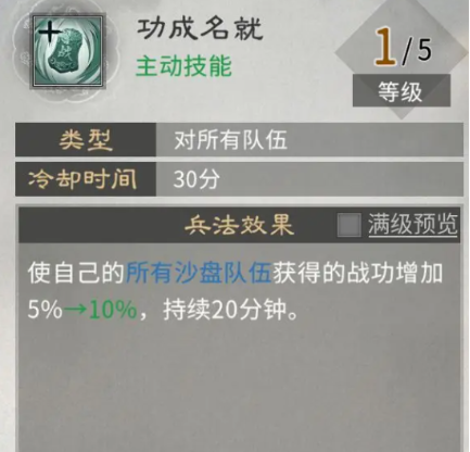 若以战功积累与榜单竞争为目标,【功成名就】为必选兵法。该技能生效期间,所有沙盘作战队伍获得5%至10%的战功加成,持续时间为20分钟。前中期大型战役频发,此增益能显著加快战功获取效率;后期冲刺排行榜、争夺战略资源点及赛季奖励时,更是不可或缺的关键支撑。建议将其作为中期重点培养对象,确保在关键节点稳定触发。