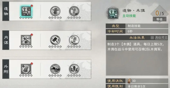 开局阶段,推荐优先解锁【造物】兵法。该技能属于主动型兵法,冷却时间短,实战适配性强。非战斗状态下,每日可生成3个木偶道具,累计使用上限为5次。在守城战中,可一次性召唤两支木偶部队,承担敌方主要火力输出,显著降低我方主力部队所受伤害,同时打乱对手技能释放节奏与阵型部署。无论用于据点防守还是中小规模野战,其战术价值均极为突出,是资源紧张期最具性价比的选择。