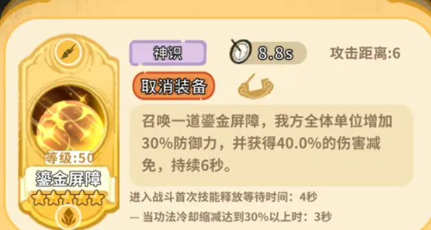 另一核心技能“鎏金屏障”可展开全体防御增益:使我方全体单位获得30%防御力提升及40%伤害减免,持续6秒。双重机制使其兼具团队承伤强化、战场控制与补充输出能力,是天道阵容中不可替代的战术支点。