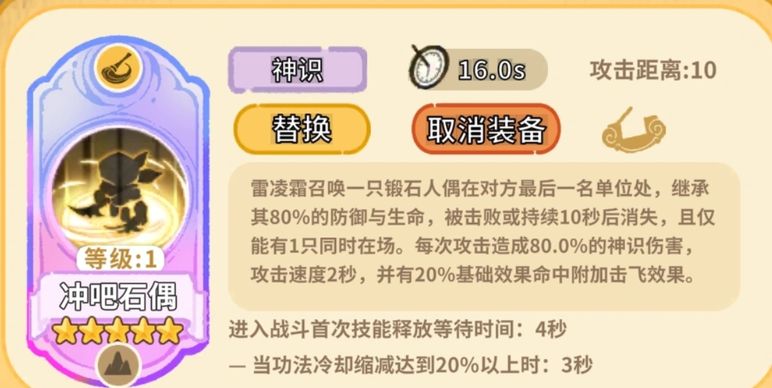 雷凌霜属于召唤流输出角色,其主动技能“冲吧石偶”可召唤锻石人偶,部署于敌方阵列最末端单位位置;该人偶继承目标80%的生命与防御属性,持续10秒或被击破后消失(场上仅允许存在1只);每次普攻造成80%神识伤害,并有概率触发击飞效果,实现持续牵制与压制。