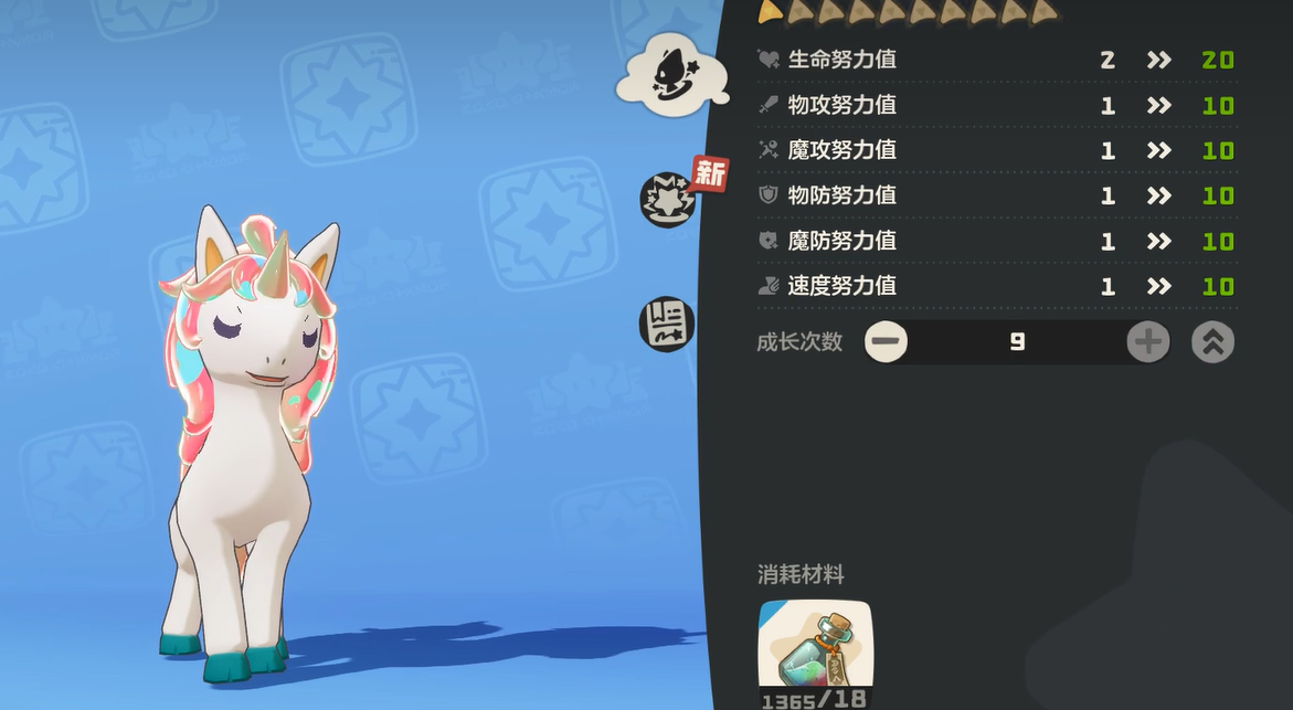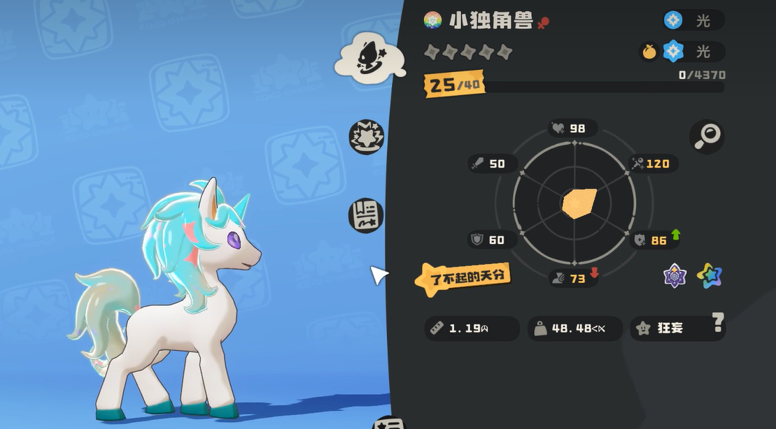 从成长维度来看,小独角兽的基础属性均衡扎实,光系稀有性叠加进阶潜力,使其具备长期培养价值。其最终进化形态为白金独角兽,进化后各项能力值将获得系统性强化,技能池亦同步扩展,进一步巩固其在PVE与部分PVP场景中的功能性地位。
