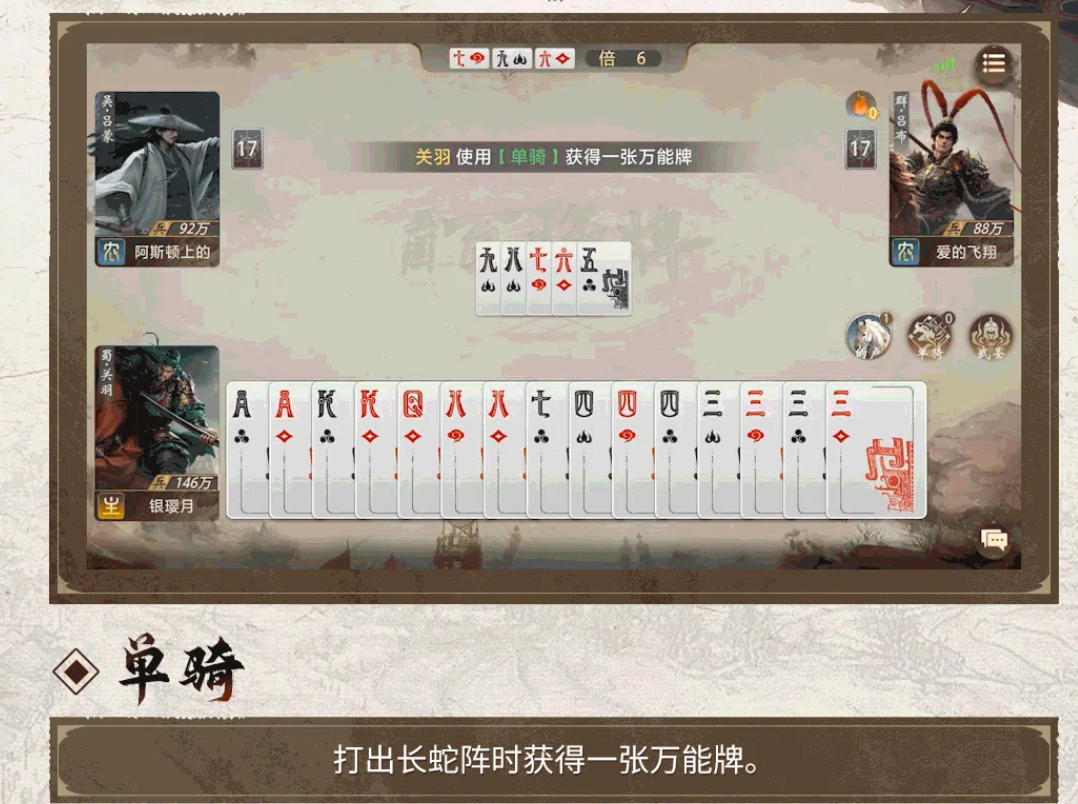 在组队模式或多人混战中,关羽的协同价值尤为突出。其获取的额外手牌与万能牌可定向支援队友:为缺关键连接牌的队友补足顺子缺口,或协助控场型武将完成多段压制。当队友手牌稀疏时,关羽可将截获的牌与万能牌组合成高权重连对,迫使对手优先消耗防御类手牌,从而为团队创造集体出牌窗口。此时,关羽不再仅是输出端,更承担起节奏发起者与资源调度者的双重角色。
