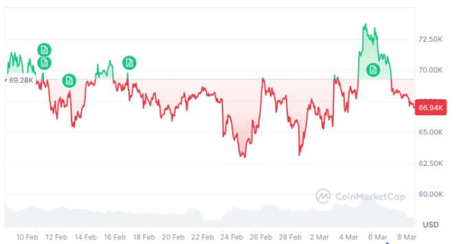 比特币近30日上涨3.74%(来源:CoinMarketCap)
