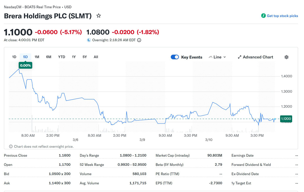 时间:2026-03-14 | 作者:318050 | 阅读:0纳斯达克上市公司Brera正在上演一场华丽转身——不仅计划更名为Solmate,更果断关闭旗下两支足球队,同时推出10比1反向拆股方案,全力押注Solana生态。这一系列动作背后,究竟藏着怎样的战略考量?