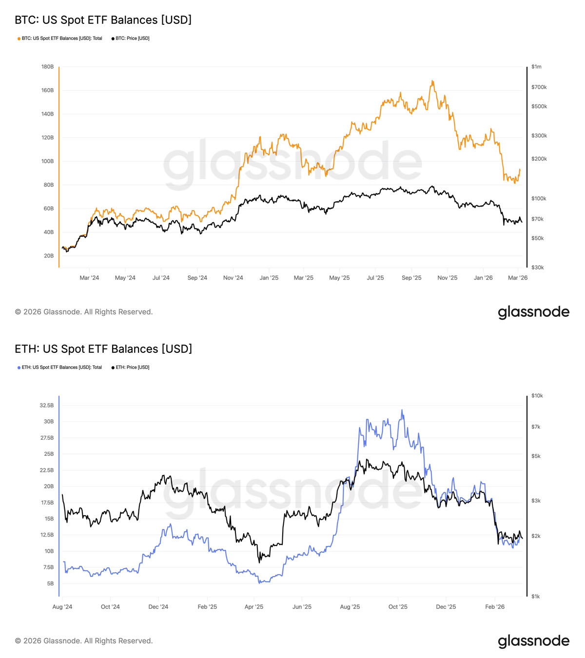 图6:美国市场比特币与以太坊现货ETF的资产余额对比。来源:Glassnode