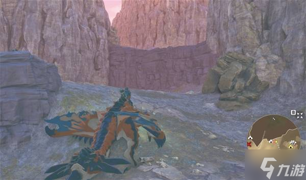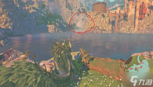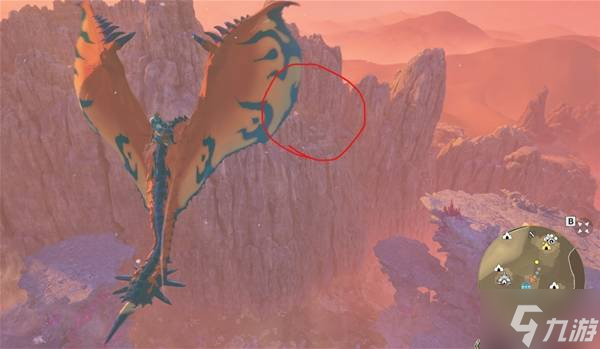 等到乘着气流到最高点后,朝着下图红圈处的山崖飞过去,到地方后,爬上峭壁后沿着路走就到了
