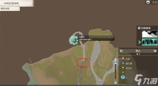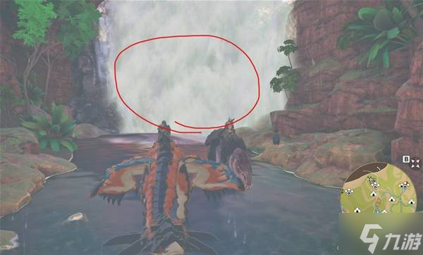 然后位置如下图,我们从红圈的地方(那里是一块瀑布),穿过瀑布,隧道到底就是了。