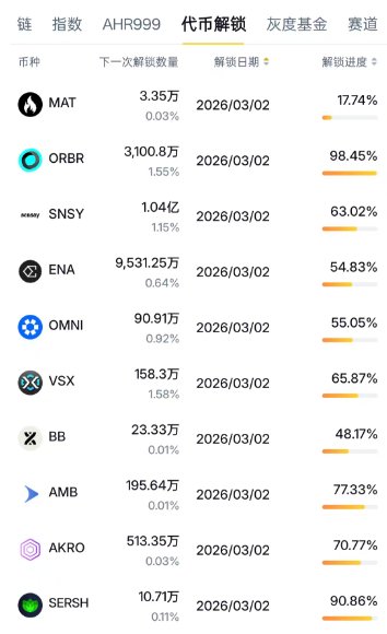 2026年3月主要代币解锁进度(部分)
