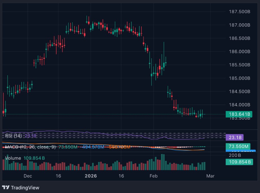 大家可能已经注意到了,Tether(也就是发行USDT的那家公司)的市值最近有点“掉秤”。这可不是偶然现象,而是连续第二个月减少了。继一月份下降1%之后,二月份又缩水了0.8%。这么一来,USDT的总市值就从接近1868.4亿美元的高点,滑到了大约1836.1亿美元。