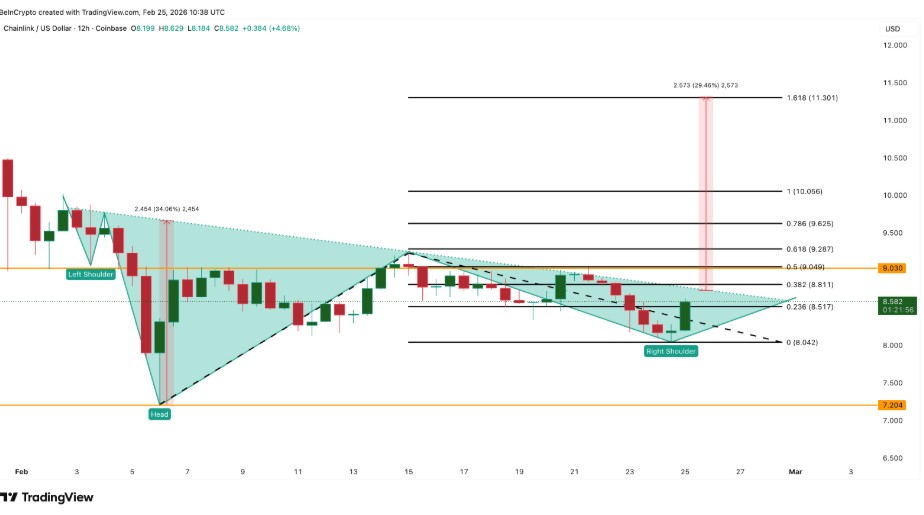目前这个颈线是向下倾斜的,位置大概在9美元附近。它之所以关键,是因为LINK在2月19日到21日之间曾经尝试突破,但没能站稳,这就进一步强化了这个位置的压力。所以,我们需要看到一个干净利落的、收盘价站稳在9美元以上的突破,才能算是有效的确认信号。