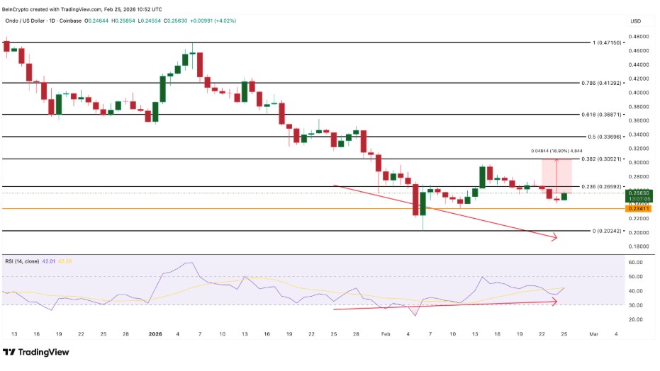 和 Stellar 类似,ONDO 从一月底到二月底,也出现了经典的看涨背离:价格创新低,但RSI指标却在抬高。这本身就是一个值得关注的信号。