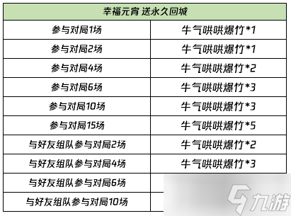 团聚元宵,牛年大吉,参与对局可获得牛气哄哄爆竹。使用可获得钻石、铭文碎片;累计使用牛气哄哄爆竹有机会获得元宵回城特效、英雄碎片、福星高照等奖励!