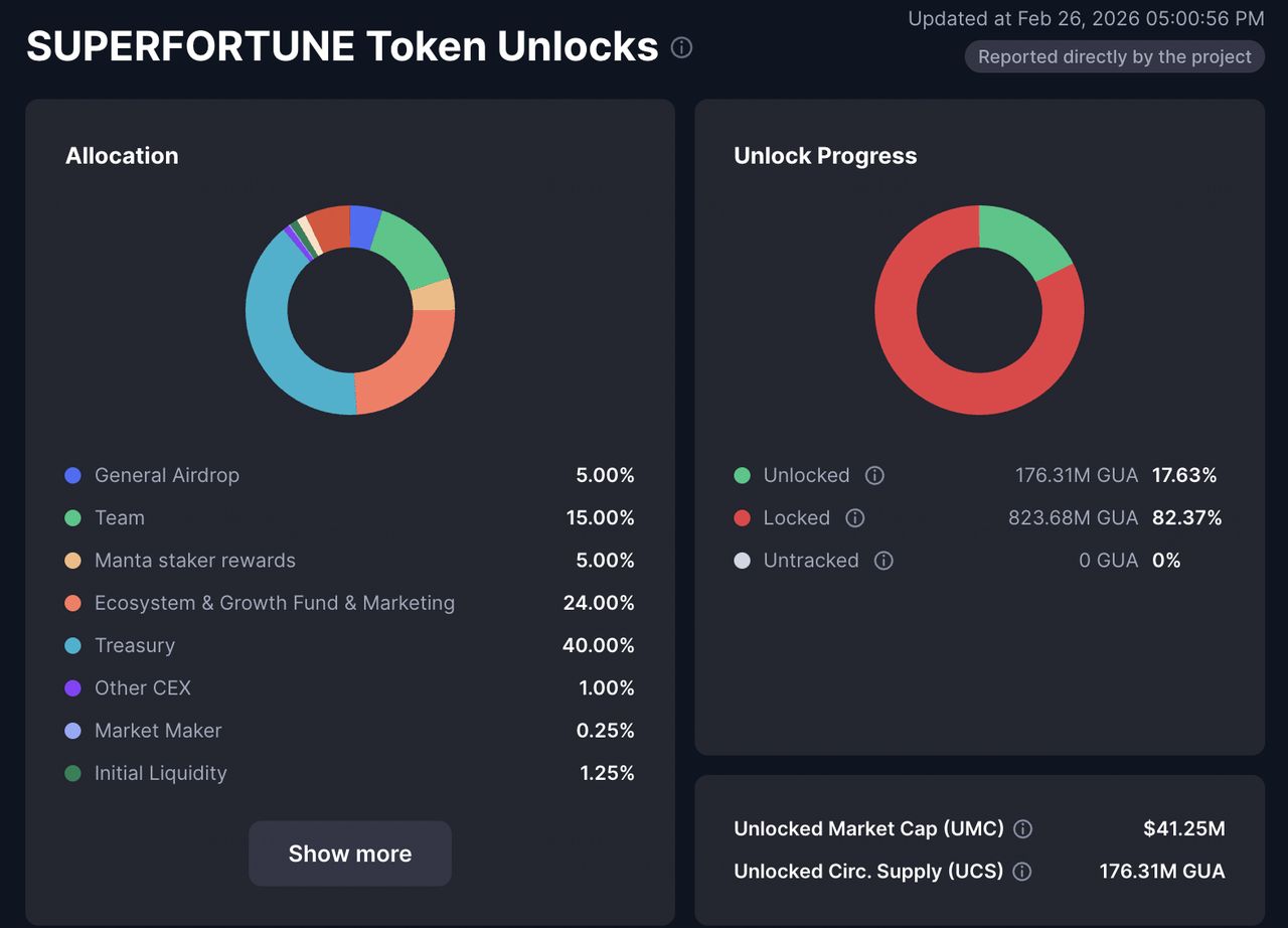 截至2026年2月26日,大约1.76亿GUA(17.63%)已经解锁,剩下8.24亿(82.37%)还在归属时间表下锁定。基于当前流通供应量,解锁市值约4124万美元——这说明代币分发还处于相当早期的阶段,未来的解锁节奏需要密切关注。