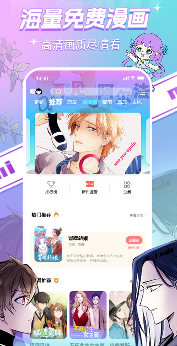 女生向的漫画平台里,资源量能做到数万部全彩的并不多见。内容以恋爱、古风、都市为主,签约了《两不疑》《喂,看见耳朵啦!》等原创作品,均为正版授权,读起来没有后顾之忧。推荐机制做得比较细,根据阅读记录来匹配内容,首页的热榜和编辑严选也方便发现新作。