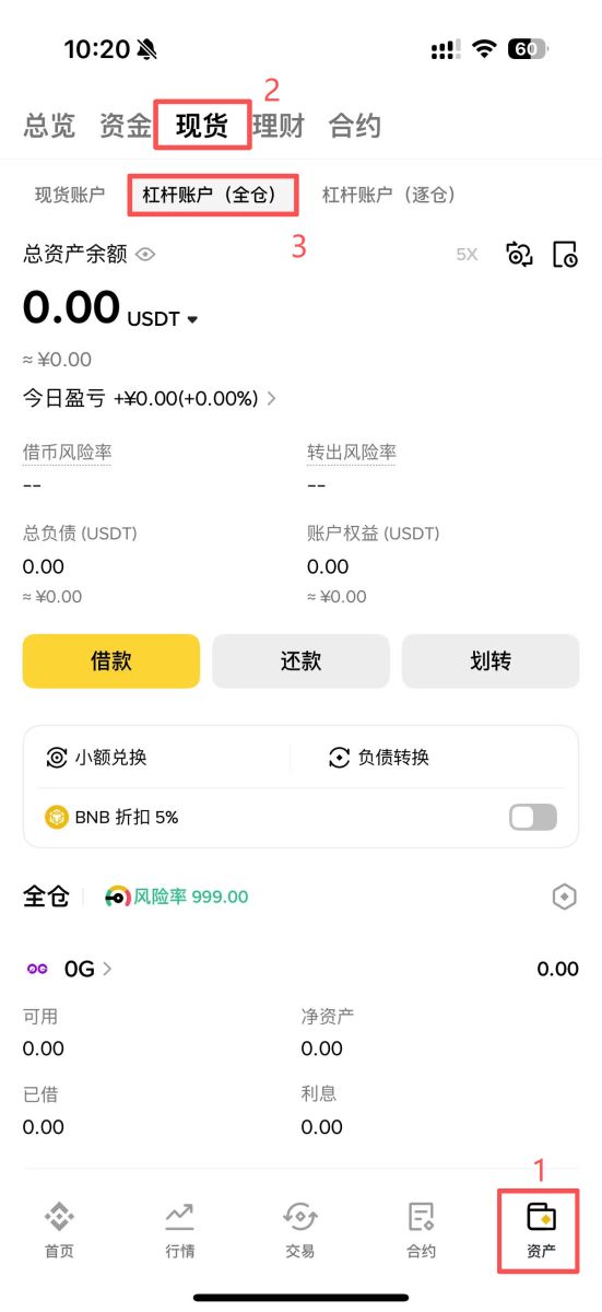 首先进入币安App,选择右下角「资产」,在现货钱包中找到「杠杆帐户(全仓)」选项。