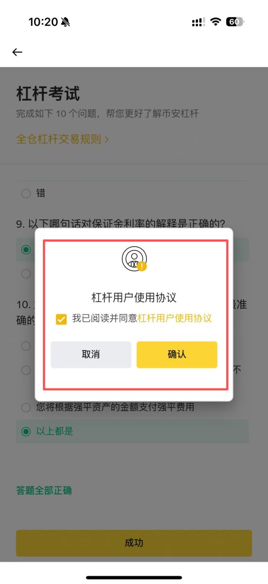 点击「立即开始」后,会进入测验界面。这里需要完成10道杠杆相关知识题目——必须全部答对才能获得交易权限。这个设计很贴心,确保每位使用者都具备基础的风险认知。
