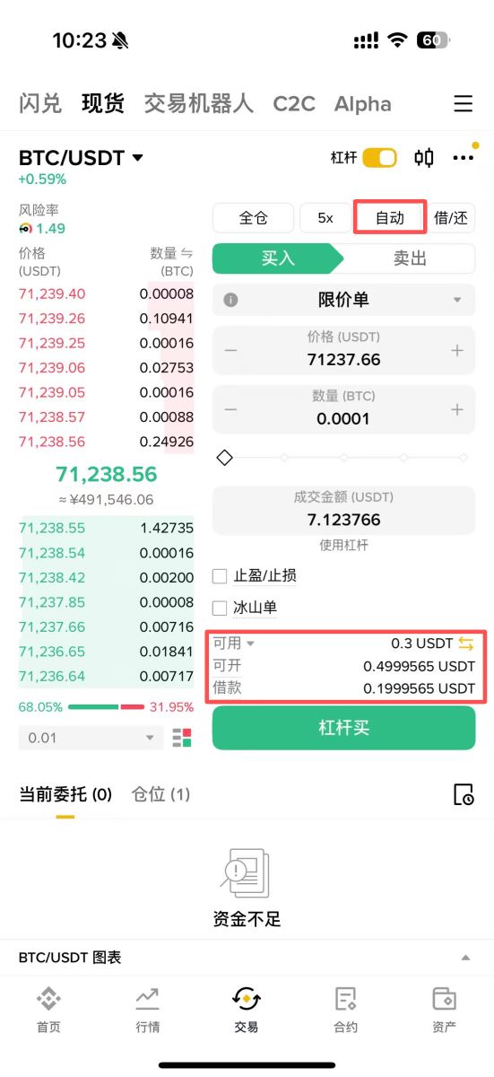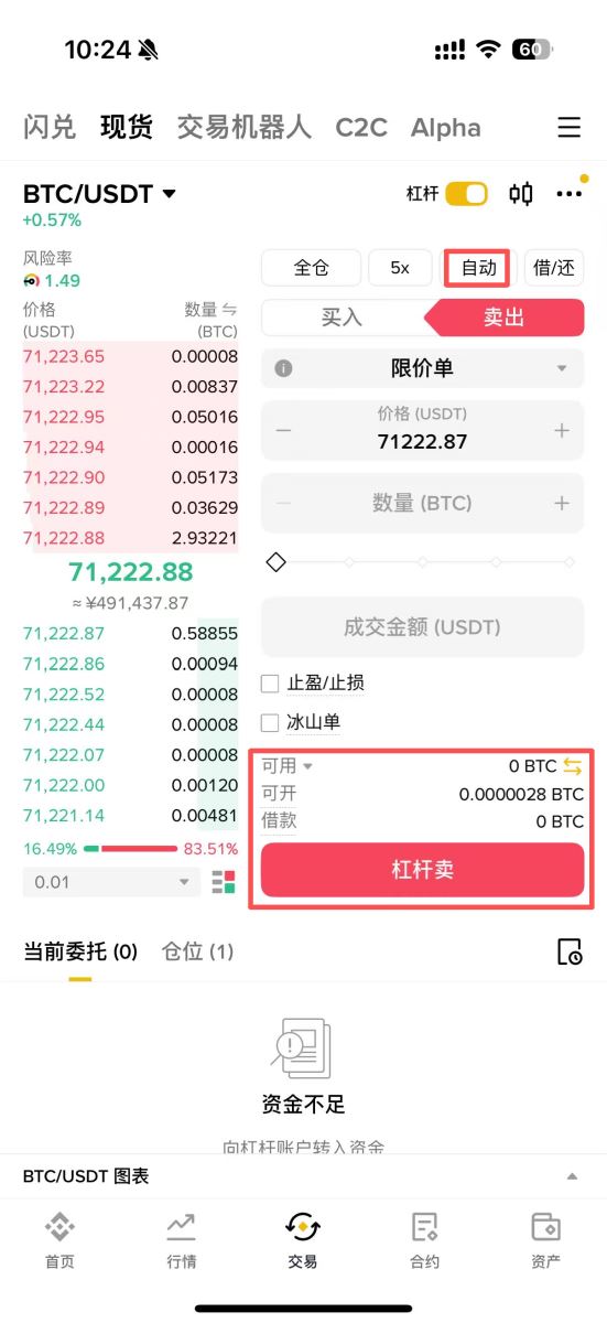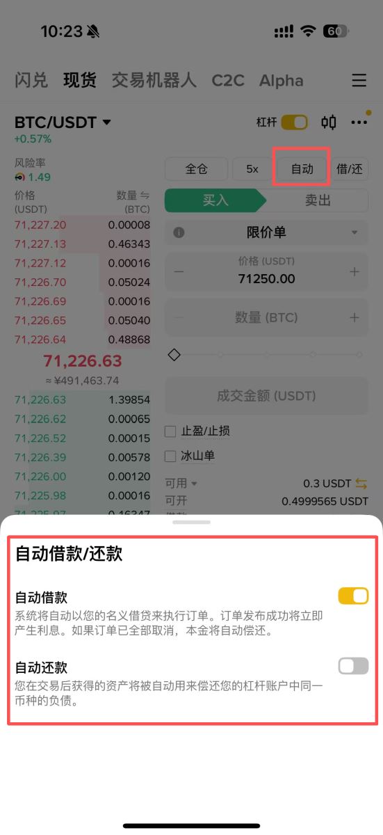 杠杆交易界面与现货交易界面99%相似,唯一区别在于多了「自动借款」和「自动还款」功能选项。