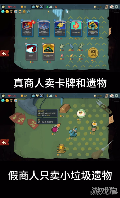 2、真商人的商店将贩卖卡牌,遗物与药水,并且支持移除卡牌,而假商人只提供劣质遗物。
