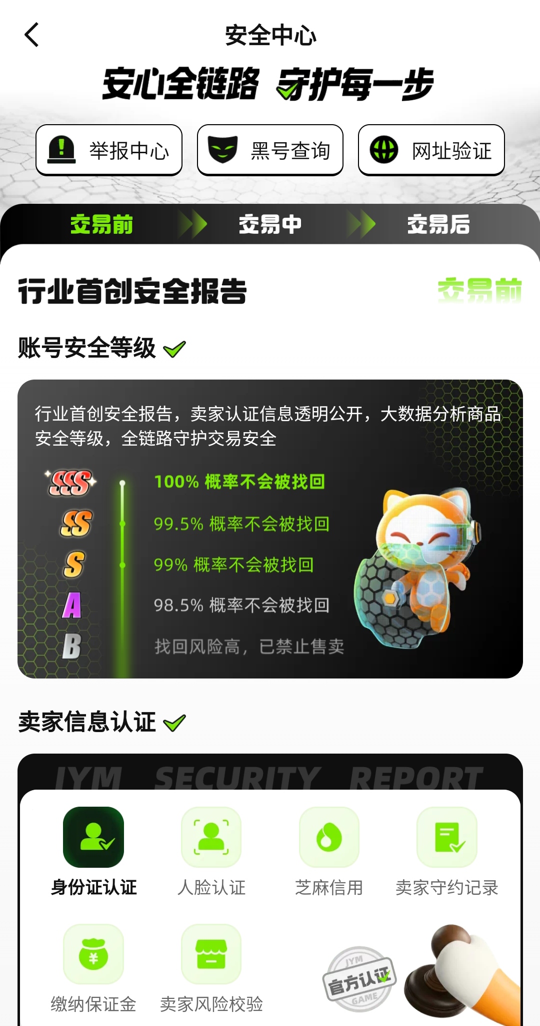 作为阿里巴巴灵犀互娱旗下专业游戏账号交易平台,交易猫已建立覆盖全链路的安全机制。平台实行双重审核制度:既对卖家资质进行实名核验,也对每一份上架账号开展真实性复检。所有账号均按风险等级动态评级,高信用、低风险账号优先展示于首页排行榜前列。交易前,系统自动执行安全预审;交易后,提供无条件售后响应。其行业首创的“永久包赔”服务面向平台全部在售账号,不设门槛、不限次数、全程覆盖。此外,用户无需下单,亦可通过首页【安全中心】系统学习账号防骗指南、实名绑定规范、找回申诉流程等实用知识。安卓用户可点击上方按钮直达下载入口;iOS用户请在浏览器中访问交易猫官网完成安装与交易。