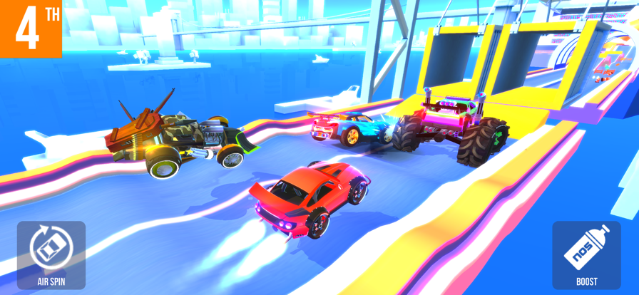 在传统竞速框架基础上拓展多维玩法:支持高速行驶中腾空跃起、释放特技动作、主动撞击对手车辆;赛车建模突破常规比例限制,每台载具均具备夸张轮廓与高饱和配色;赛事进程中可实时投掷道具、触发表情反馈,增强竞技过程中的即时互动性。