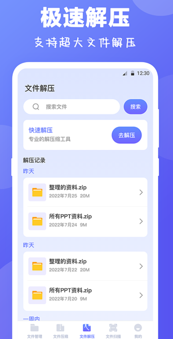 集成解压引擎与智能文件管理双核心,无需切换应用即可完成从解压到整理的全流程。支持格式达40+种,包括ZIP、7Z、RAR、TAR、APK、ISO、DEB等,自动识别分卷压缩包(如.part1.rar、.001)并合并处理;对密码保护压缩包提供稳定解密支持。压缩功能同样丰富:可调节压缩级别(存储/最快/标准/最大),设置AES-128/AES-256加密,自定义分卷大小。文件浏览支持网格/列表双视图,内置回收站防误删;压缩包内文档、图片、音视频均支持原生预览,MP4、MP3等格式可直接播放;解压后文件一键分享至微信、邮件等平台,操作链路顺畅。