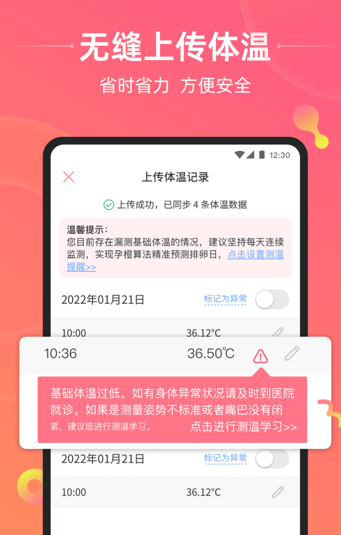 以科学备孕为出发点,采用德国SENSIPLAN自然受孕法原理,融合基础体温曲线、排卵试纸检测结果及宫颈黏液变化等多维数据,实现排卵窗口期精准预测,误差控制在4小时内。配套蓝牙智能体温计自动上传数据并生成动态图表,免除手动录入负担;同房记录、症状反馈等功能联动后,系统可推送个性化易孕提醒,帮助提升受孕效率。