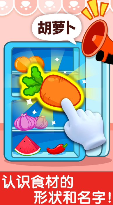 完整还原厨房操作全流程:清洗食材、切配处理、热锅下油、翻炒装盘,甚至延伸至自制果汁与鲜奶调制。切菜交互具备物理反馈感,刀落有声、食材分块可视;15种常见果蔬(如苹果、胡萝卜、香蕉)全程标注中英文双语名称,同步强化命名能力与生活认知。