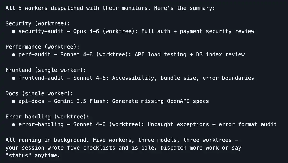 Dispatch 跨 3 个模型并行启动 5 个 worker——你的会话保持精简,智能体在干活