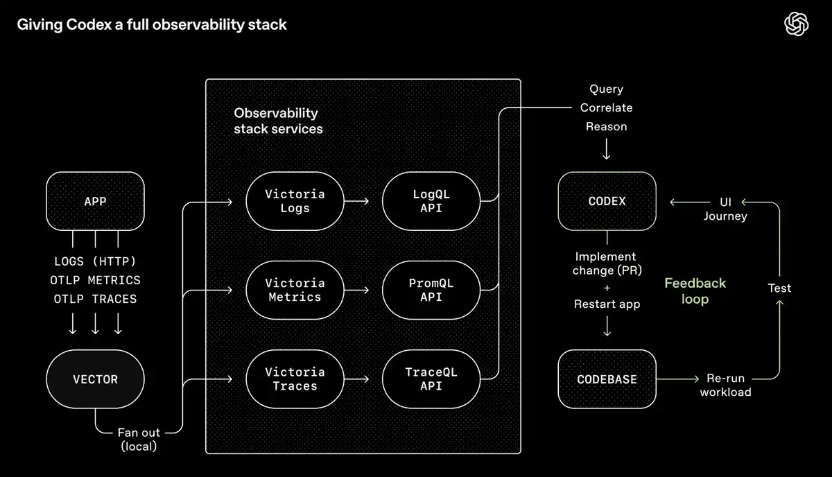 OpenAI 的 Codex 工具链——一套完整的可观测性系统,让智能体可以查询、关联和推理自己的输出(来源:OpenAI)