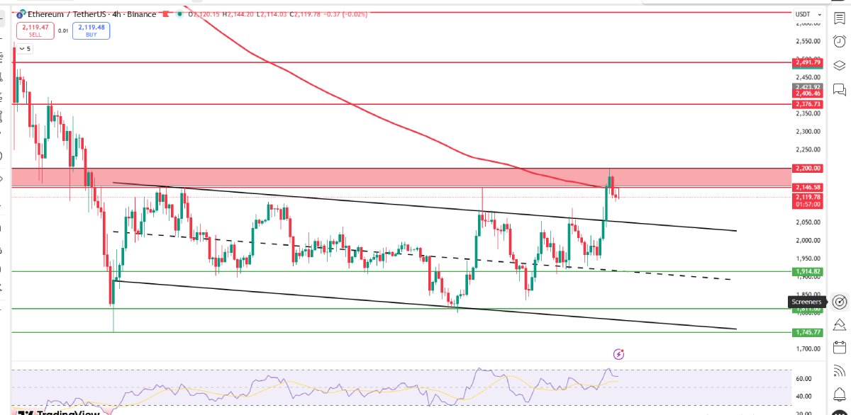 分析师Crypto Patel在X上分享的最新观点认为,在强劲反弹后,该代币已接近2200美元。他分析指出,如果当前的上涨势头得以保持,下一个关键阻力区域可能在2500美元至2600美元之间,那里在高时间框架图表上存在一个显着的“公允价值缺口”。