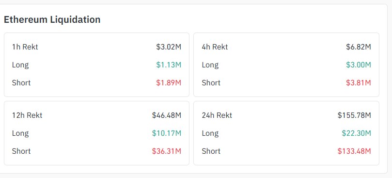 看看数据就明白了:根据Coinglass的统计,过去一天,价值超过1.55亿美元的ETH相关头寸被强制平仓。
